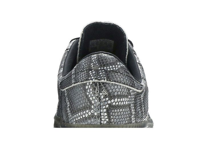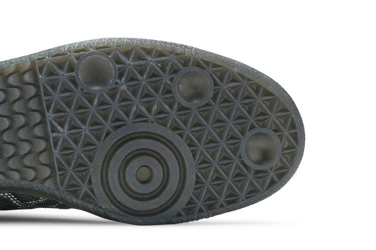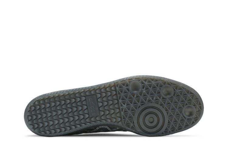 The adidas Samba Fucking Awesome Jason Dill Black features a black full-grain leather upper with matching toe and eyestay overlays. White leather accents the heel tab and three-stripe side panels. The black tongue displays Fucking Awesome branding in white script, while the insole has gold dual branding. A dark gray semi-translucent midsole contrasts with the black rubber outsole, patterned with circles and triangles. Released on May 24, 2023, the adidas Samba Fucking Awesome Jason Dill Black is available now at Side Kicks.