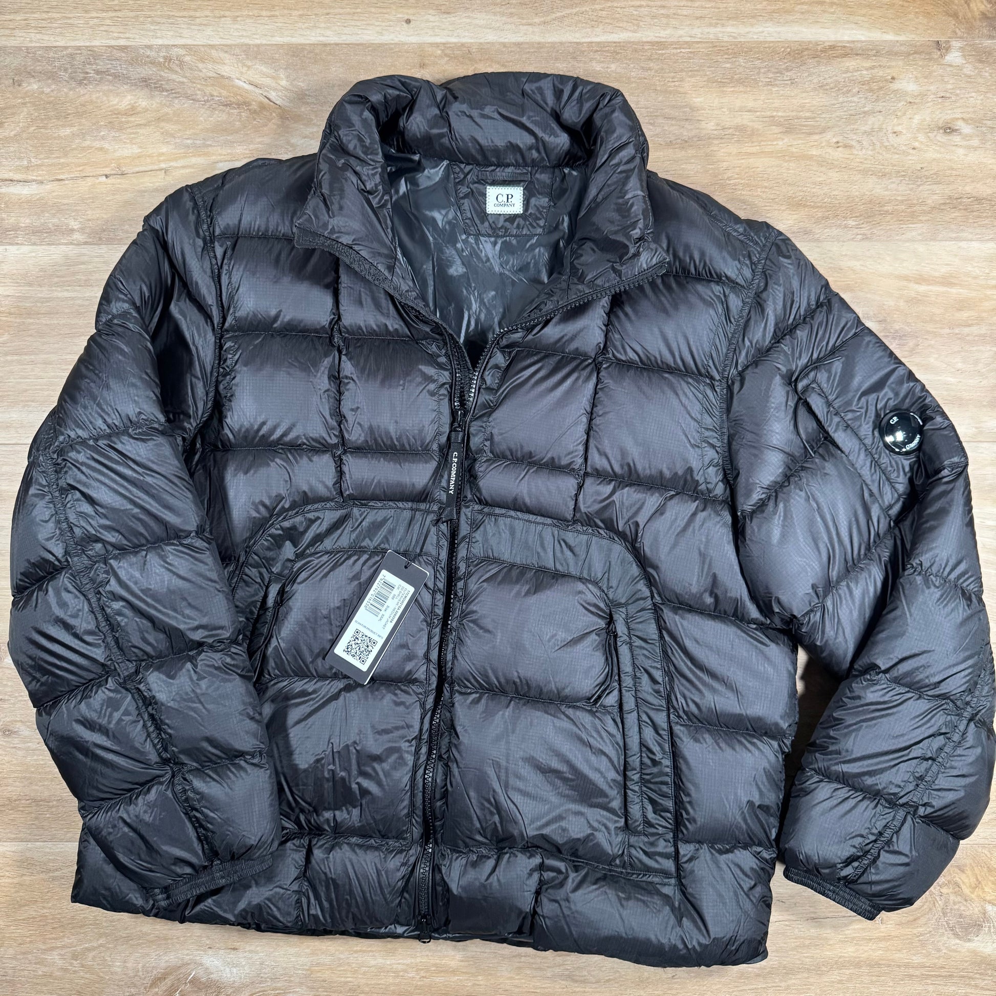 CP Company hooded short down jacket made from D.D. Shell, a lightweight, transparent 7-denier micro-ripstop nylon. Featuring Direct Down Injection, it includes a concealable adjustable hood, two-way zip fastening, side zip pockets, Lens detail, and ribbed cuffs.