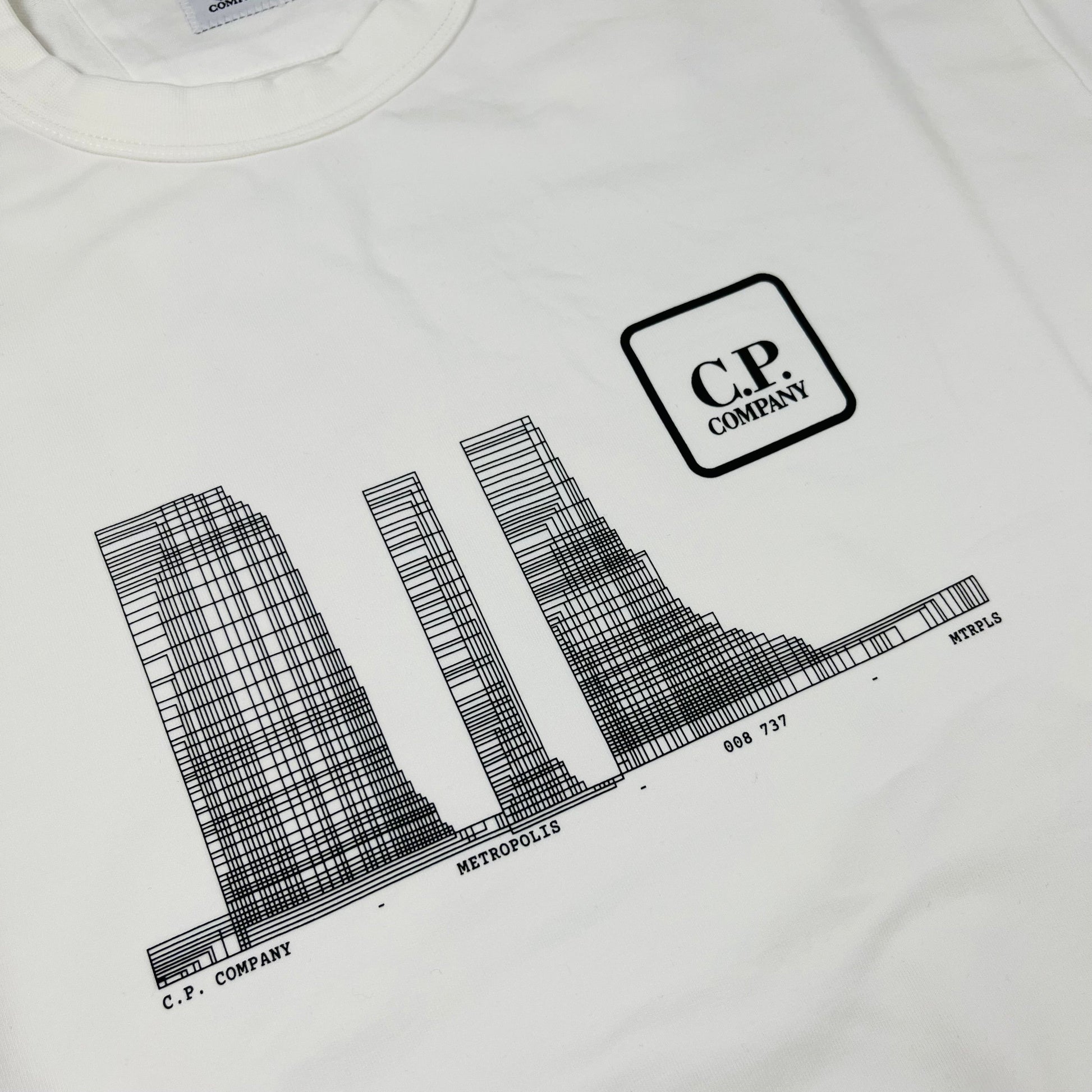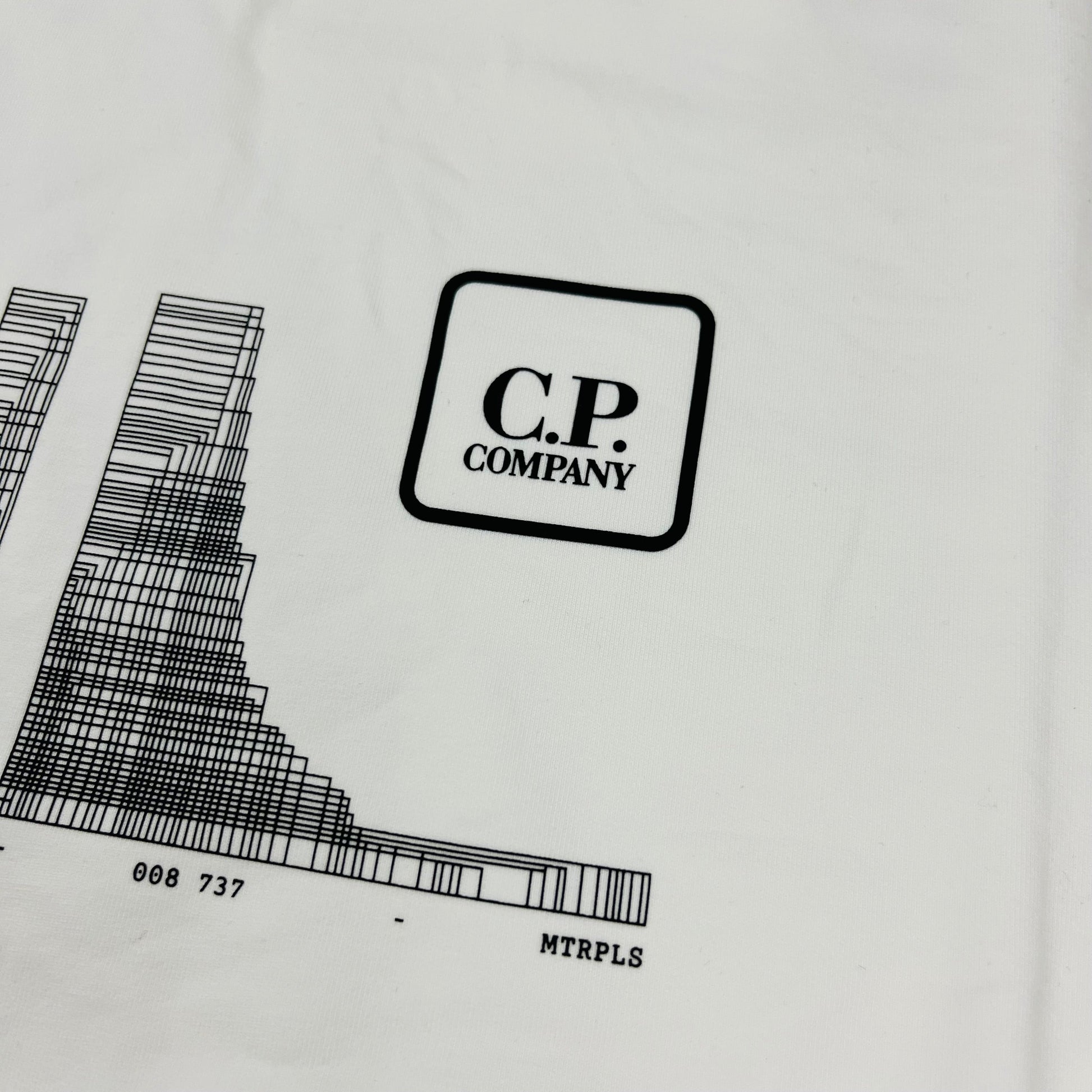 Gauze White CP Company Metropolis stretch fleece sweatshirt with urban cityscape chest printed graphic and patch logo