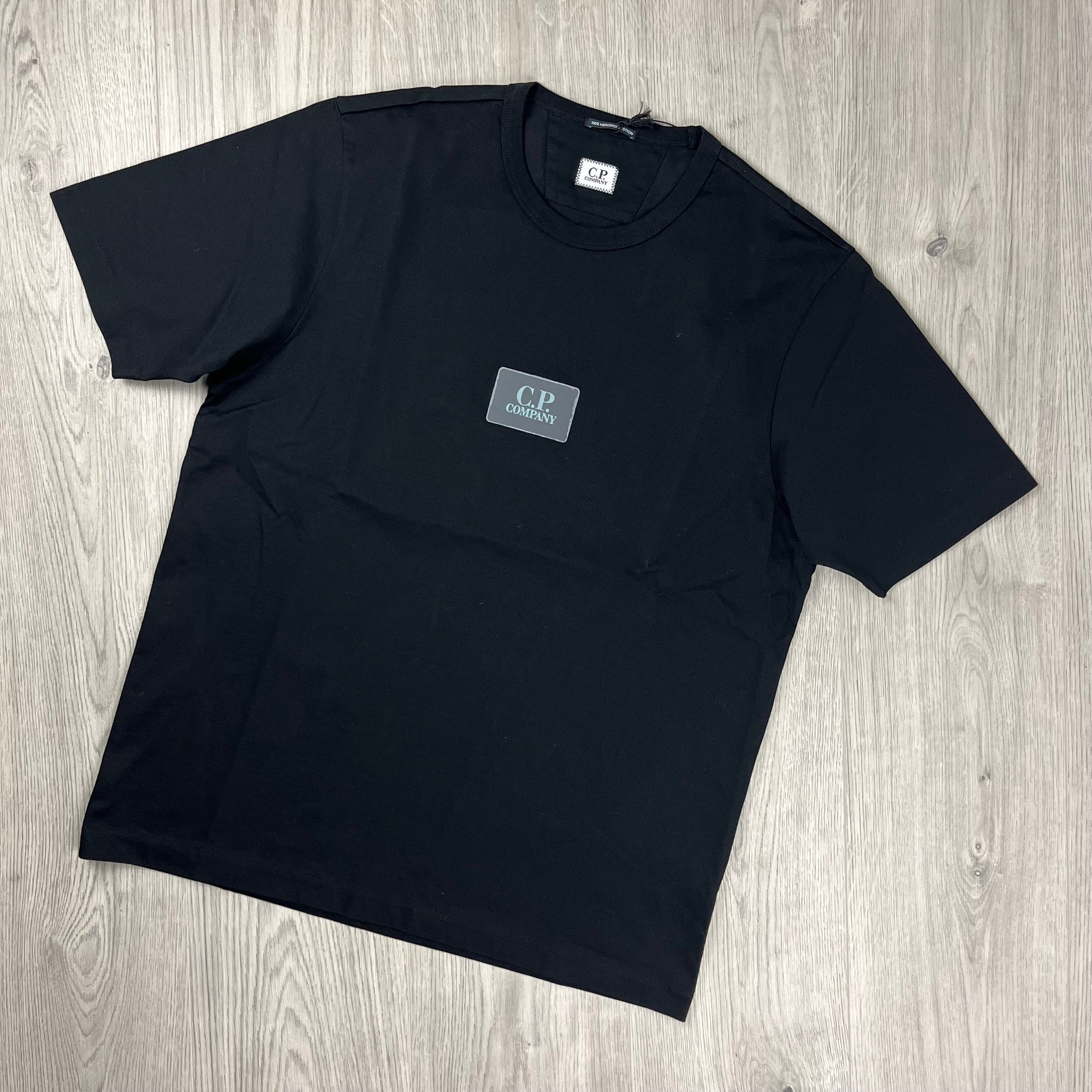 Black CP Company mercerized jersey T-shirt with centrally printed patch logo on the chest