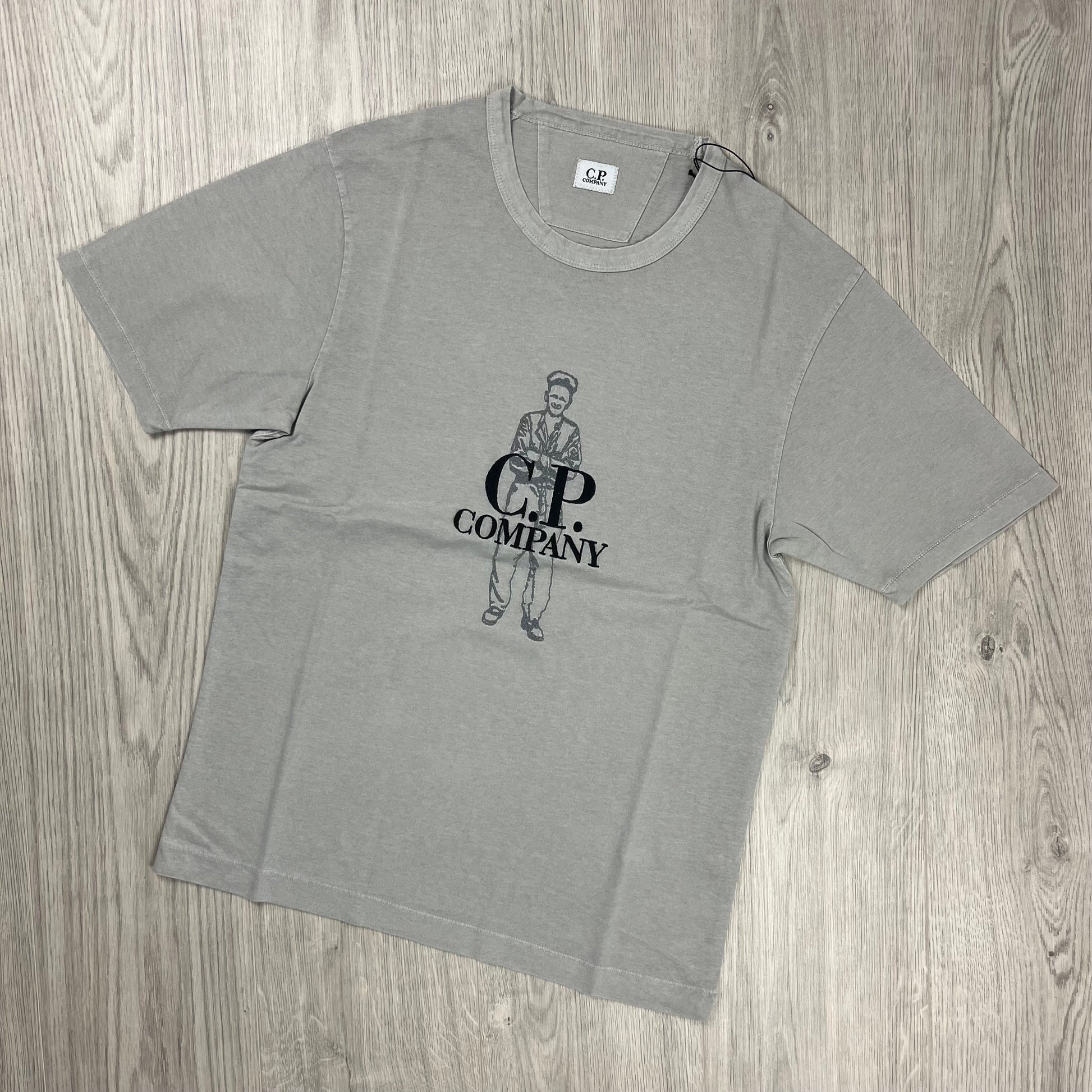 Drizzle Grey CP Company T-shirt with centrally printed logo in white with three sailors.