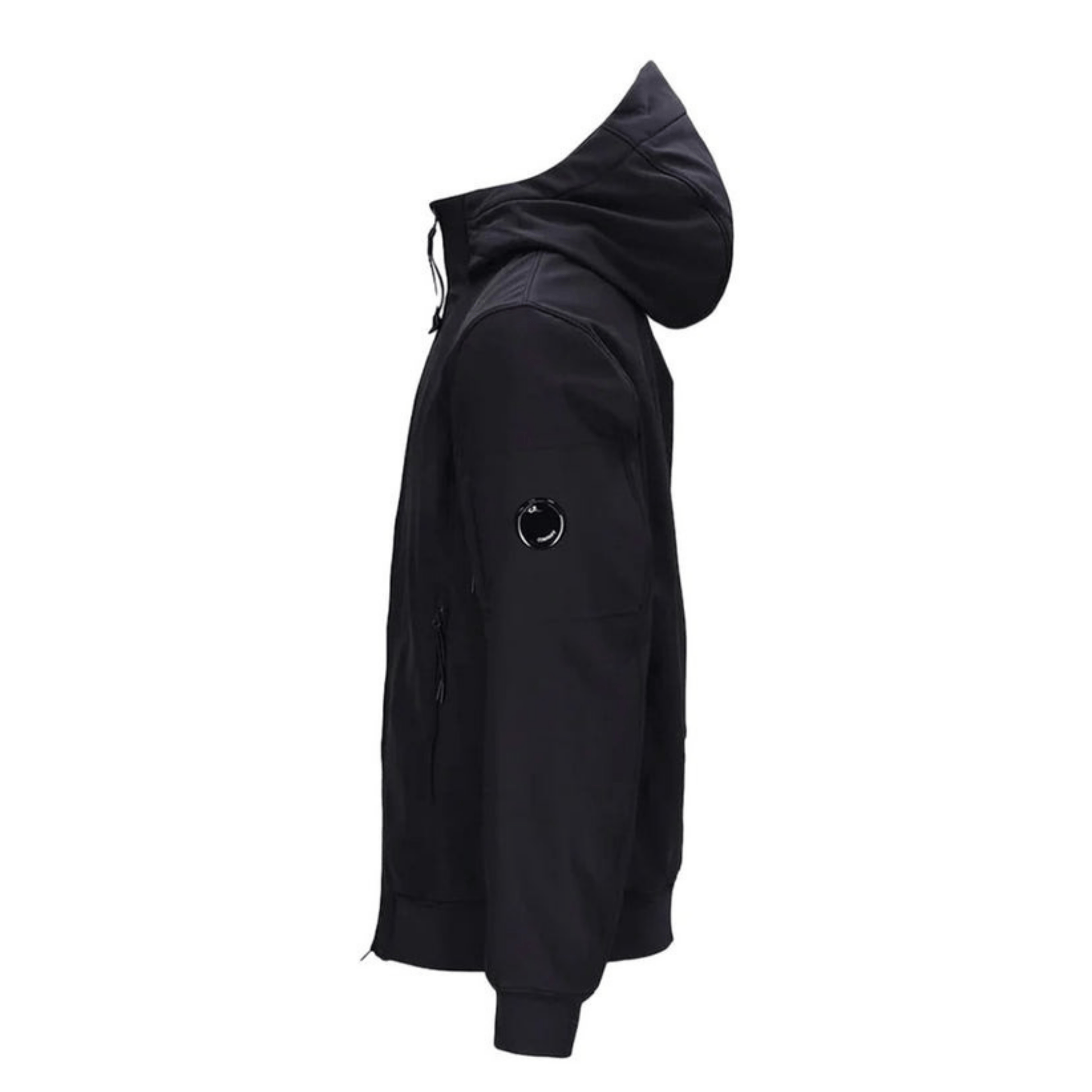 Black CP Company Shell-R jacket with adjustable hood and sleeve lens detail
