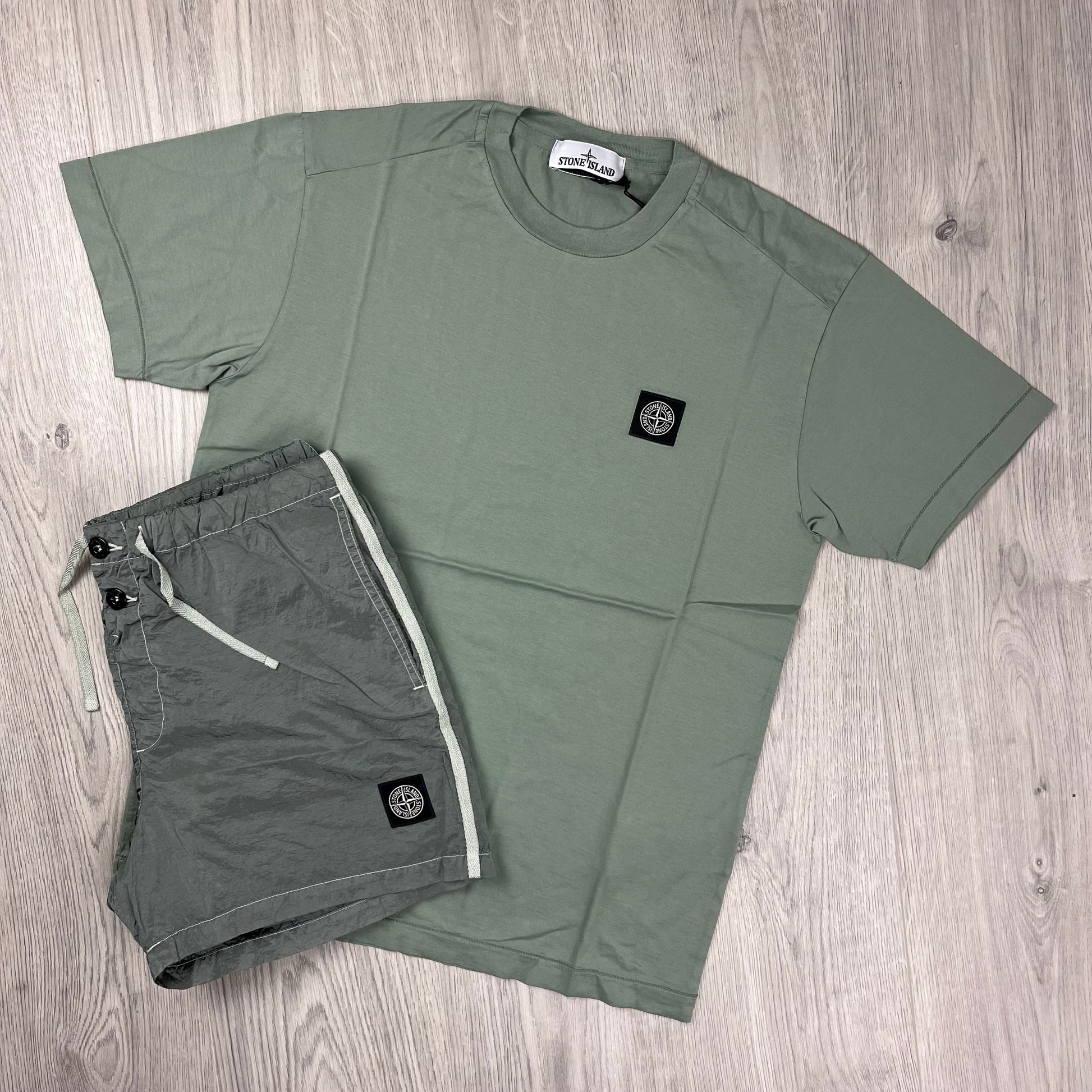 - 60/2 jersey cotton garment dyed T-shirt with black patch logo appliqué