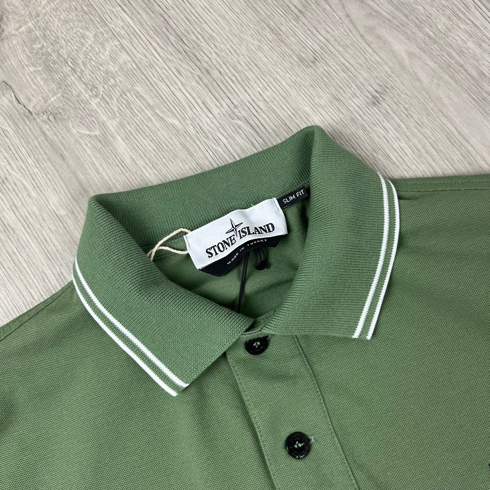 Men’s Stone Island polo in sage with patch logo and tipped sleeves & collar.