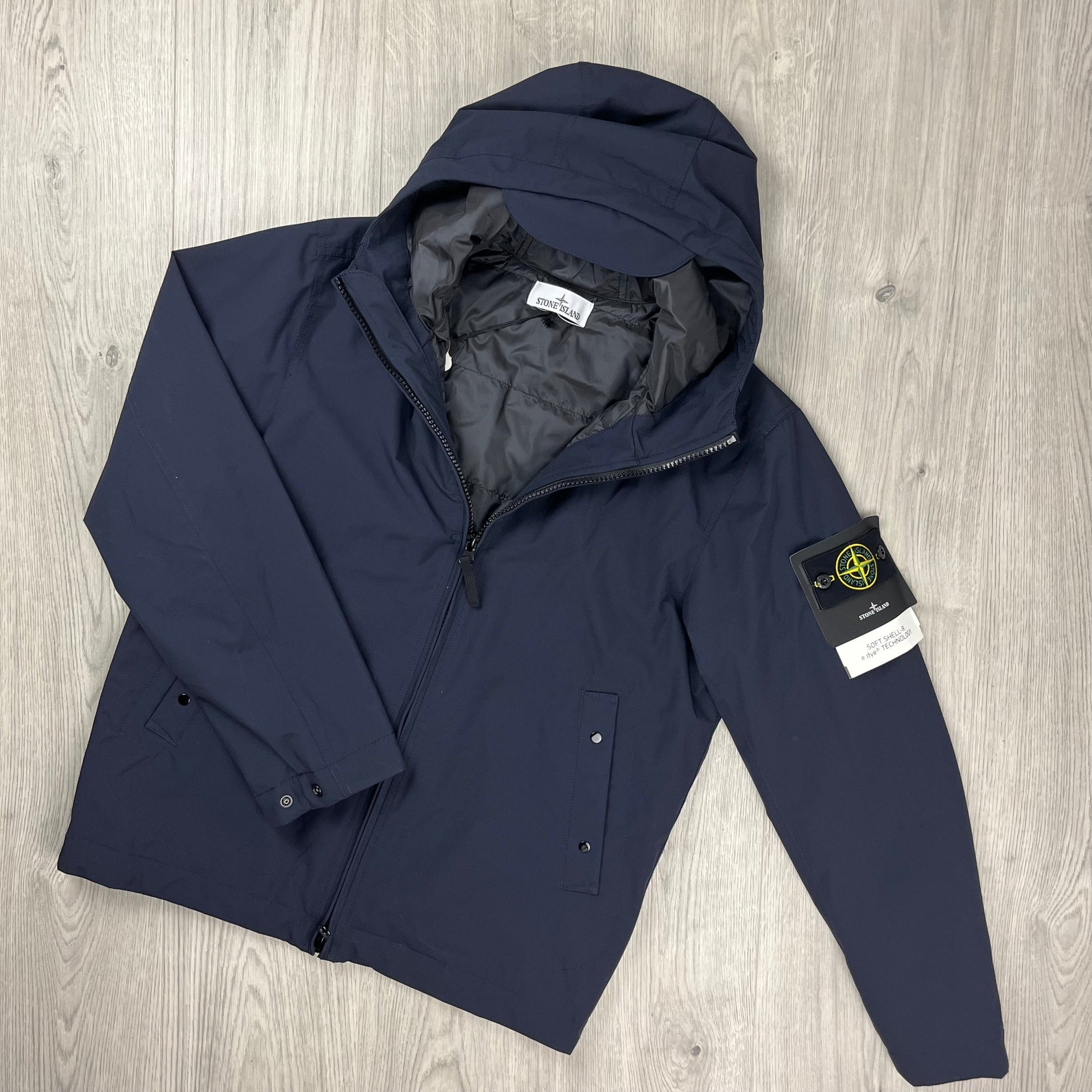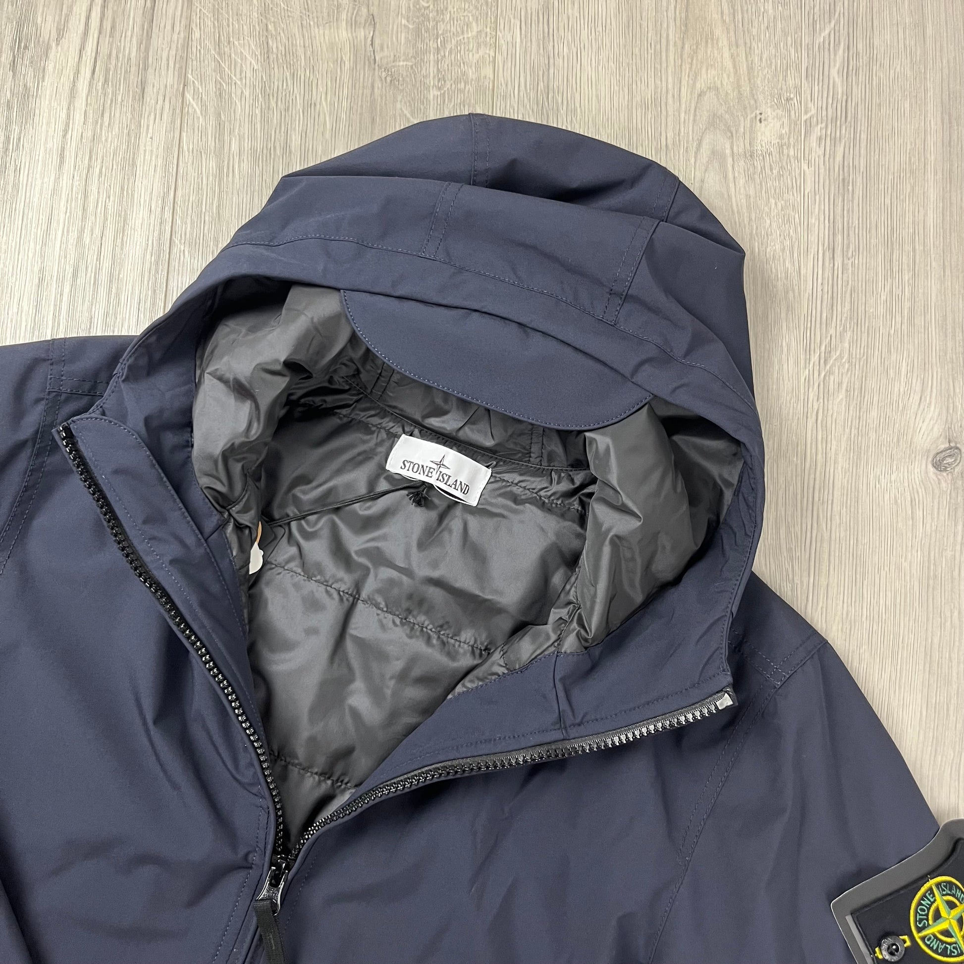 Navy Blue Stone Island PrimaLoft padded Soft Shell-R e.dye hooded jacket with sleeve badge